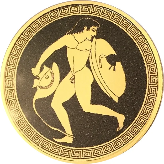Nude warrior with shield and helmet in a meander pattern.