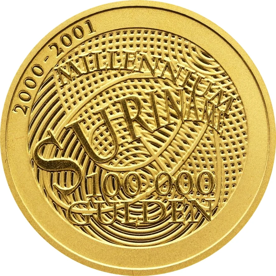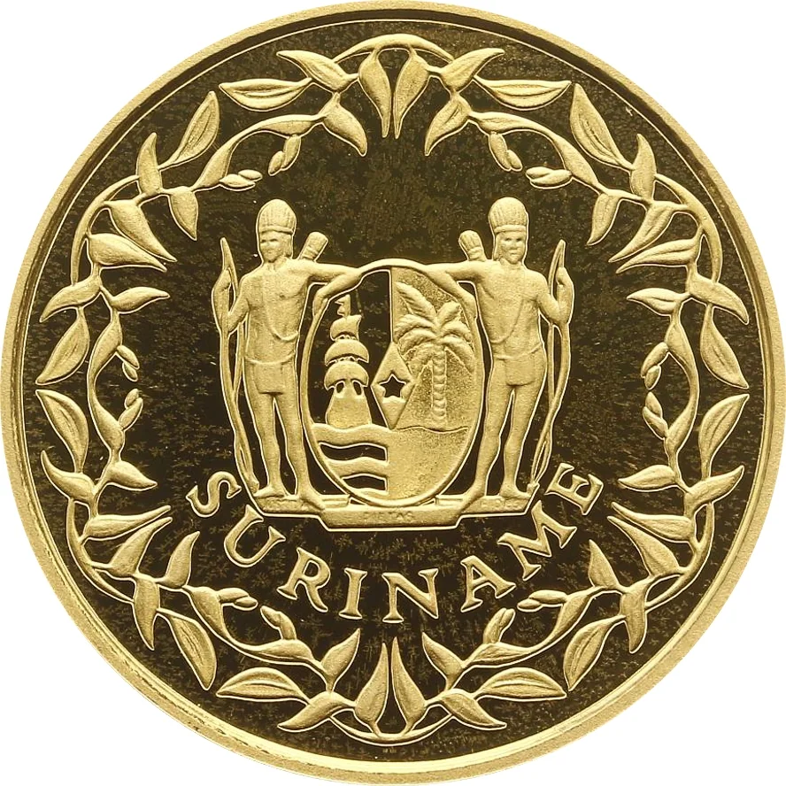 Suriname's coat of arms with native supporters above a legend, encircled by a wreath.