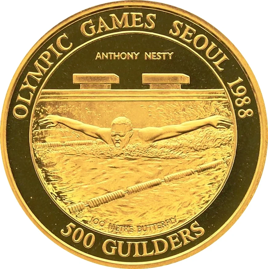 Anthony Nesty swimming butterfly. Text in English around the image.