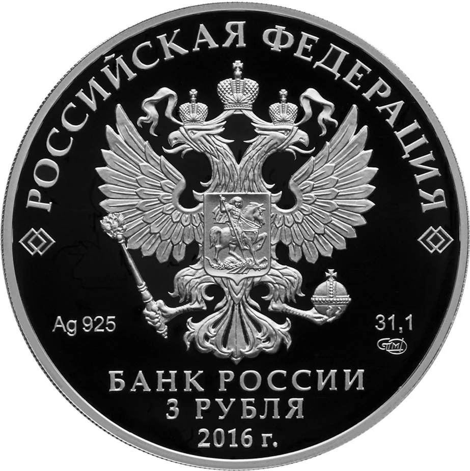 State Coat of Arms of the Russian Federation. Inscriptions: "РОССИЙСКАЯ ФЕДЕРАЦИЯ", "БАНК РОССИИ", "3 РУБЛЯ", "2016", metal designation, purity, mint mark, and fine metal content.