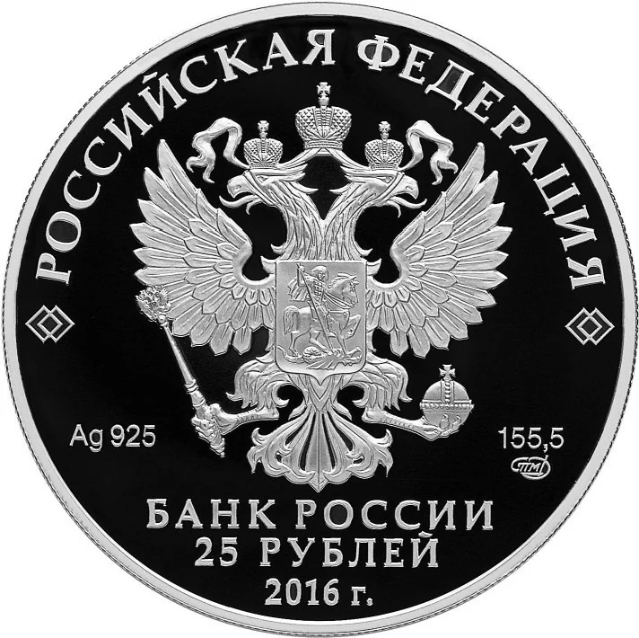 State Coat of Arms of the Russian Federation. Inscriptions: "РОССИЙСКАЯ ФЕДЕРАЦИЯ", "БАНК РОССИИ", "25 РУБЛЕЙ", "2016", metal designation, purity, mint mark, and fine metal content.