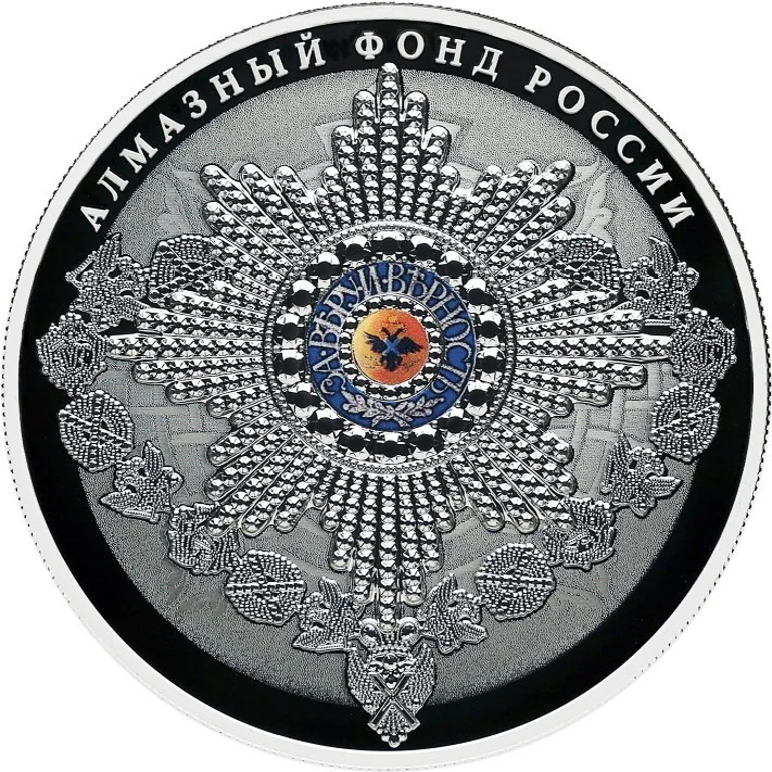 The colored relief images of the Star, Badge, and Great Imperial Collar of the Order of St. Andrew. Above, the circumferential inscription reads: “АЛМАЗНЫЙ ФОНД РОССИИ” (DIAMOND FUND OF RUSSIA).
