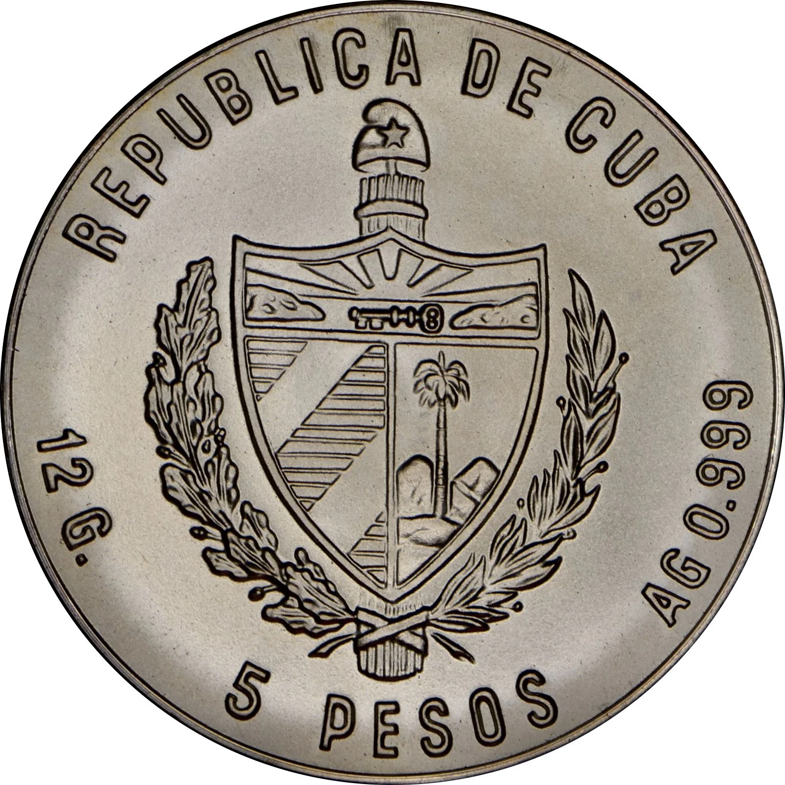 Cuban coat of arms with country name above, weight and finess on the sides, and face value below.