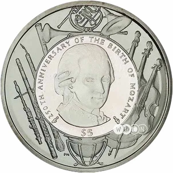 Young Mozart centered with instruments and the ring's face value.