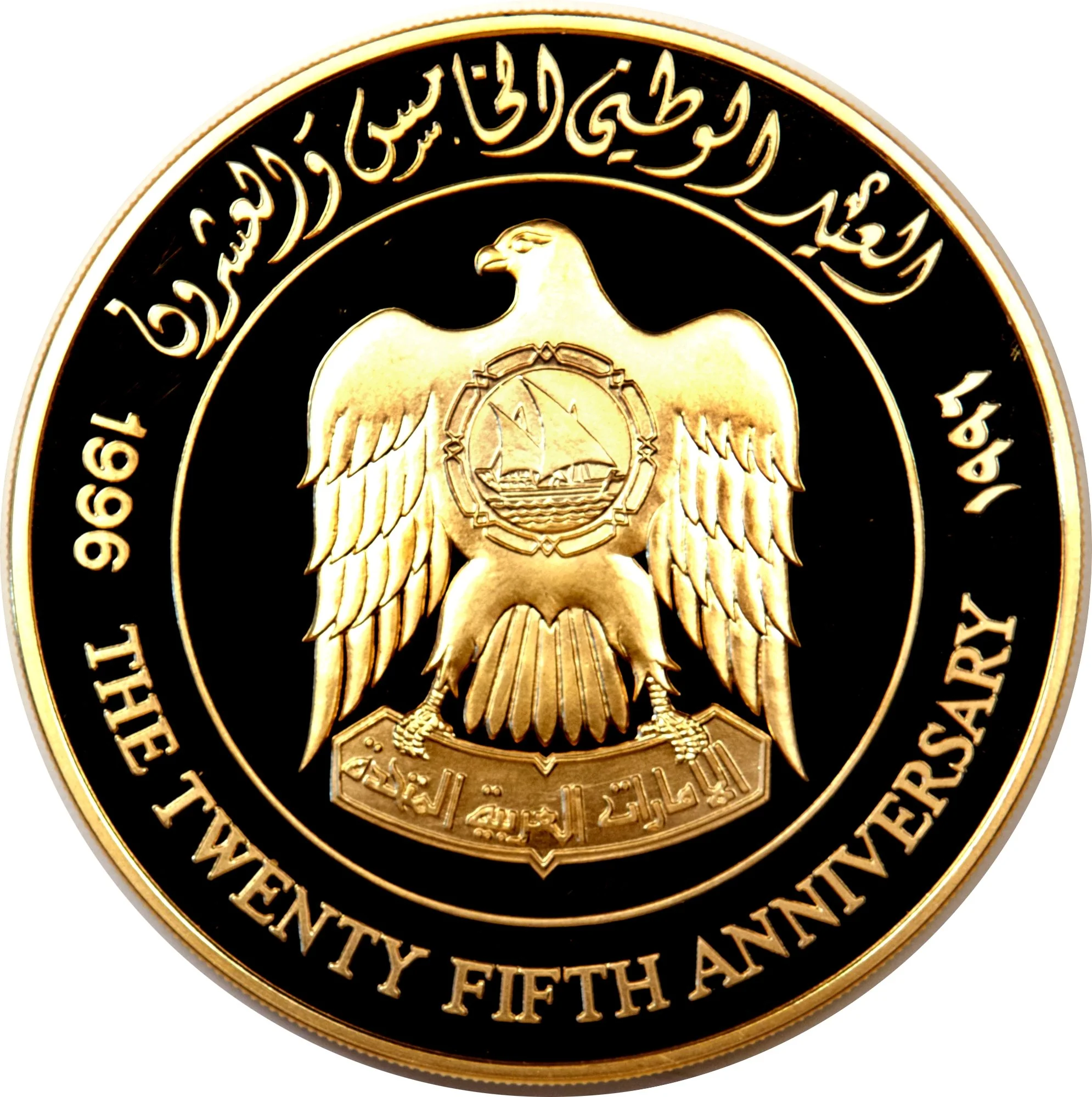 The former UAE emblem features Saladin's falcon holding a disk with an Arab sailboat, encircled by a chain. Its talons grip a parchment bearing the federation's name in Kufic script.