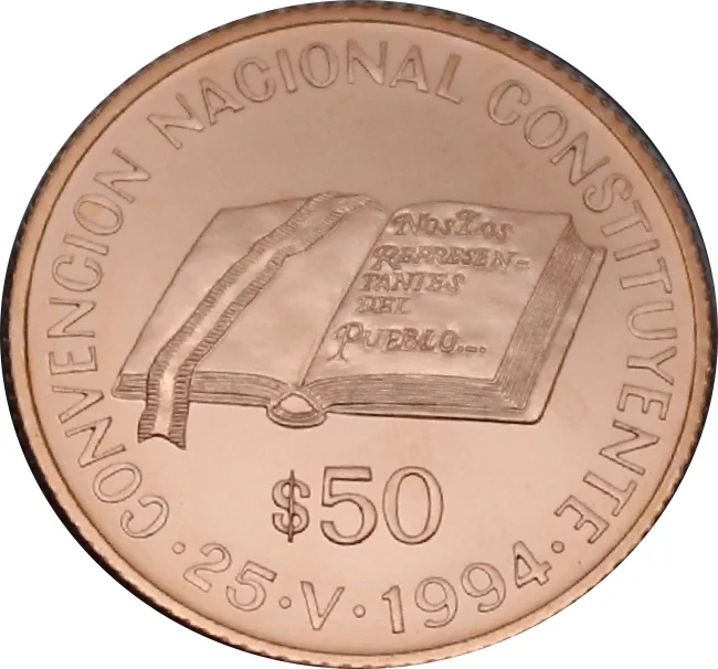 Our Constitution coin: Features the Constitutional Preamble's start, "We the representatives of the People..." under its denomination. Edge reads "National Constituent Convention" and the date "25. V. 1994," when the convention began.