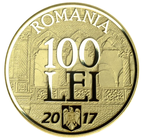 Brâncovenesc-style design featuring "ROMANIA" in an arc, the coat of arms, "100 LEI", and the year 2017.