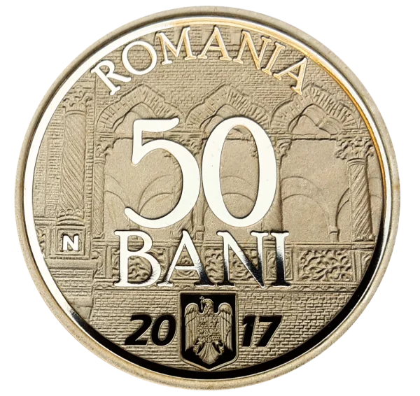 A Brâncovenesc-style design featuring "ROMANIA" in an arc, "50 BANI," Romania's coat of arms, and the year 2017.