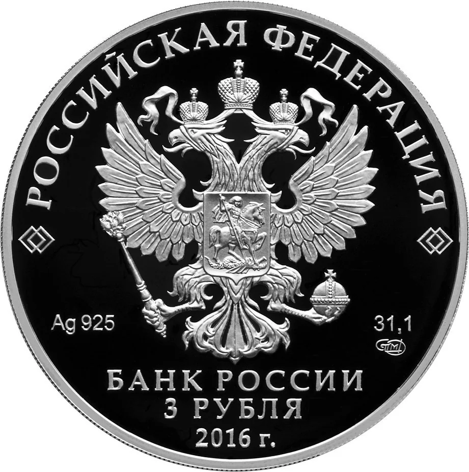 The obverse features the Russian Federation coat of arms with "РОССИЙСКАЯ ФЕДЕРАЦИЯ" above, framed by doubled rhombuses. Below are the metal specifications and mint mark. The bottom center has "БАНК РОССИИ", "3 РУБЛЯ", and "2016 г." in three lines.