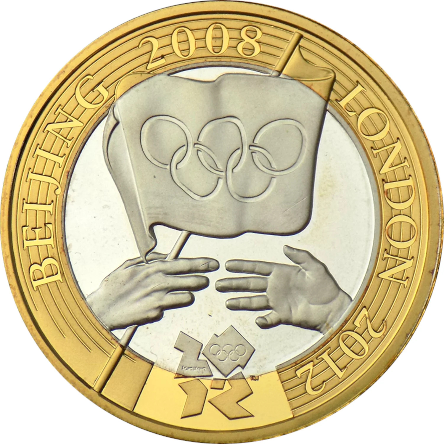 Olympic flag handoff over London 2012 logo, surrounded by legend and dates.