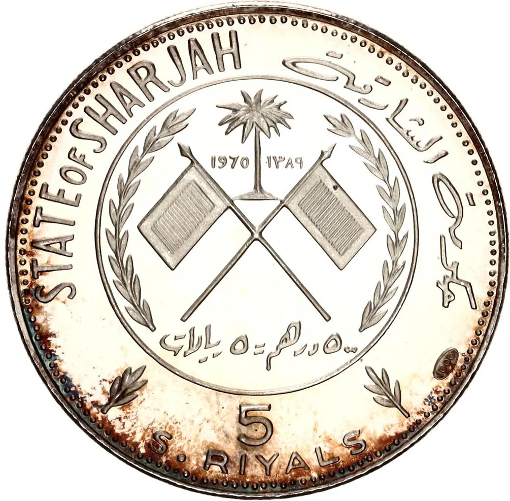 Sharjah coat of arms: crossed flags under a palm tree, encircled by laurel.