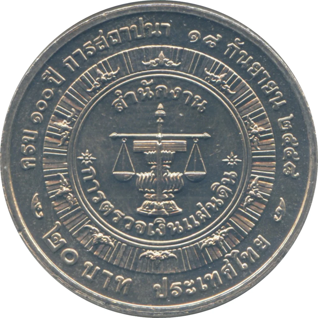 Description: State Audit Office symbol: Balanced scales before the Thai constitution on a two-tiered phan, encircled by ten outward-pointing Thai motifs and an inscription.