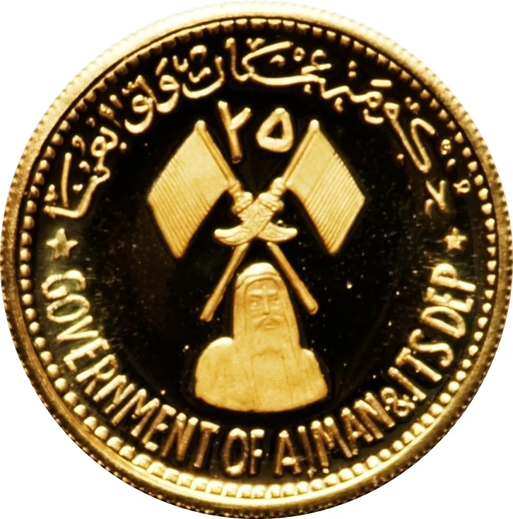 Description: State emblem centered, "25" above in Arabic. "Government of Ajman & Its Dep" in Arabic above and English below. Bust of Sheikh Rashid Bin Humaid Al Nuaimi below emblem, facing forward.