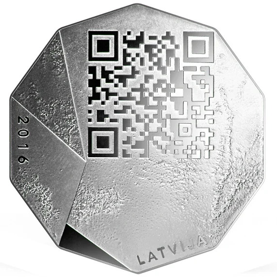 A QR code for the future is at the top, with 2016 on the left and LATVIJA at the bottom.