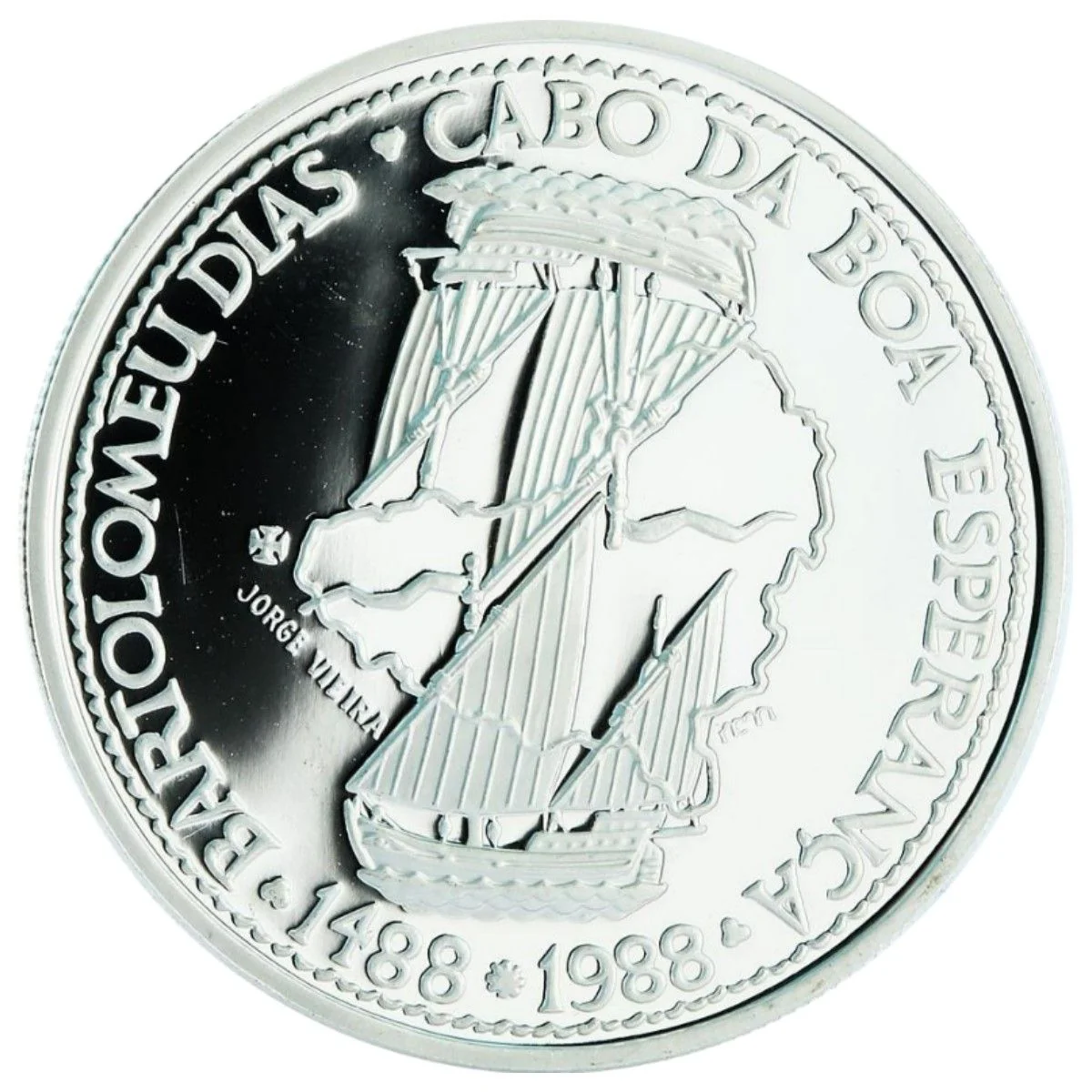 Bartolomeu Dias's 500th anniversary rounding the Cape of Good Hope. Features a south-leaning map of Africa flanked by two opposing caravels with lateen sails, encircled by names. Dates below.