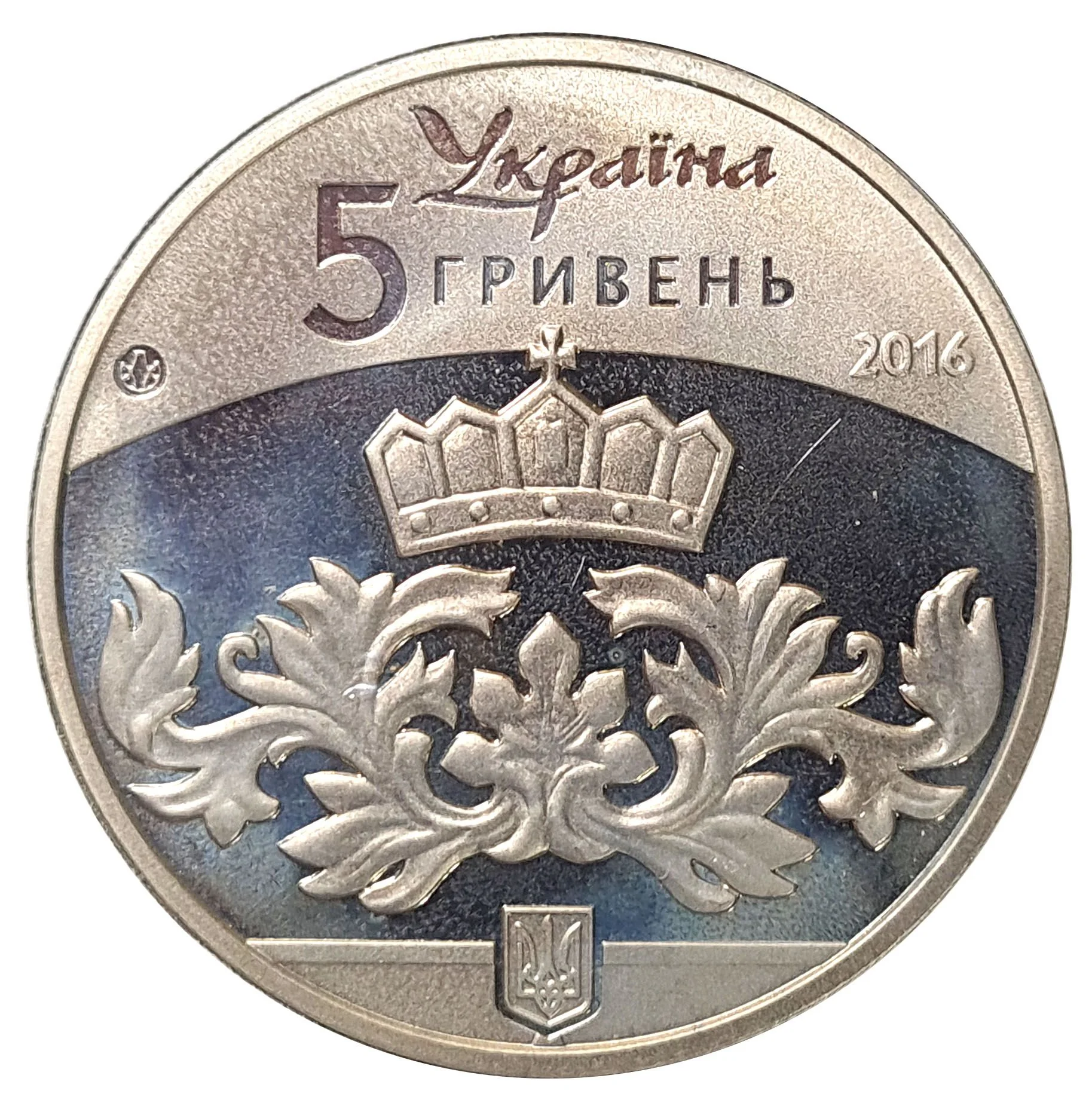 The obverse features Ukraine's name, face value (5 hryvnias), year (2016), mint mark, and a stylized princely crown with floral ornament above the small coat of arms.