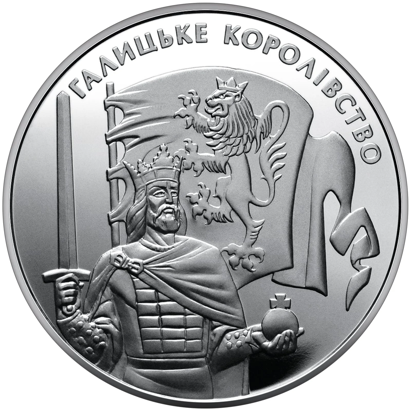 On the left, against a matt background, are the coin's denomination, "УКРАЇНА," the year 2016, and the mint mark. On the right, against a smooth background, a heraldic lion of Galicia-Volhynia holds a shield with Ukraine's small coat of arms.
