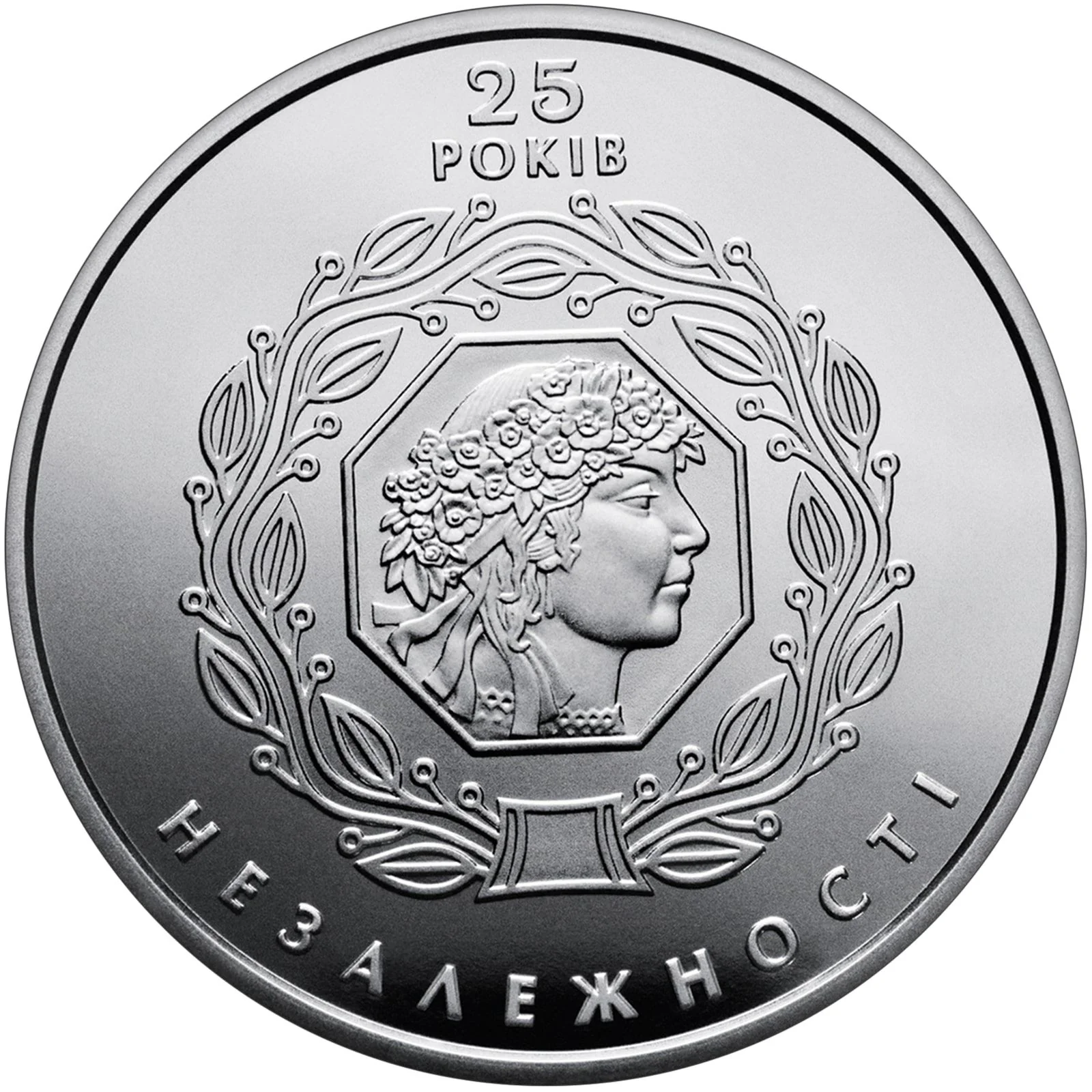 Description: The design integrates elements from the obverses of the 'Kyiv Rus', 'Galicia Kingdom', and 'Cossack State' coins, symbolizing Ukraine's historical stages. A lion and a Cossack hold the small coat of arms, topped by a floral ornament and crown. Below on a matt background are УКРАЇНА, 5 ГРИВЕНЬ, the year 2016, and the NBU mint mark.