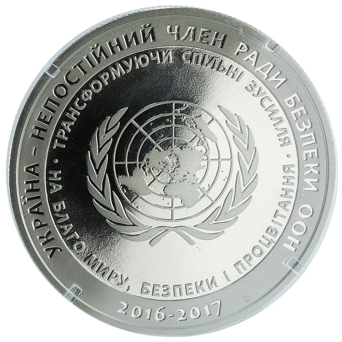 Description: The UN emblem is set against a smooth background with the circular inscription: "Transforming joint efforts to achieve peace, security and prosperity." Against a matt background, a second circular legend reads: "Ukraine: non-permanent member of the UN Security Council, 2016 - 2017."