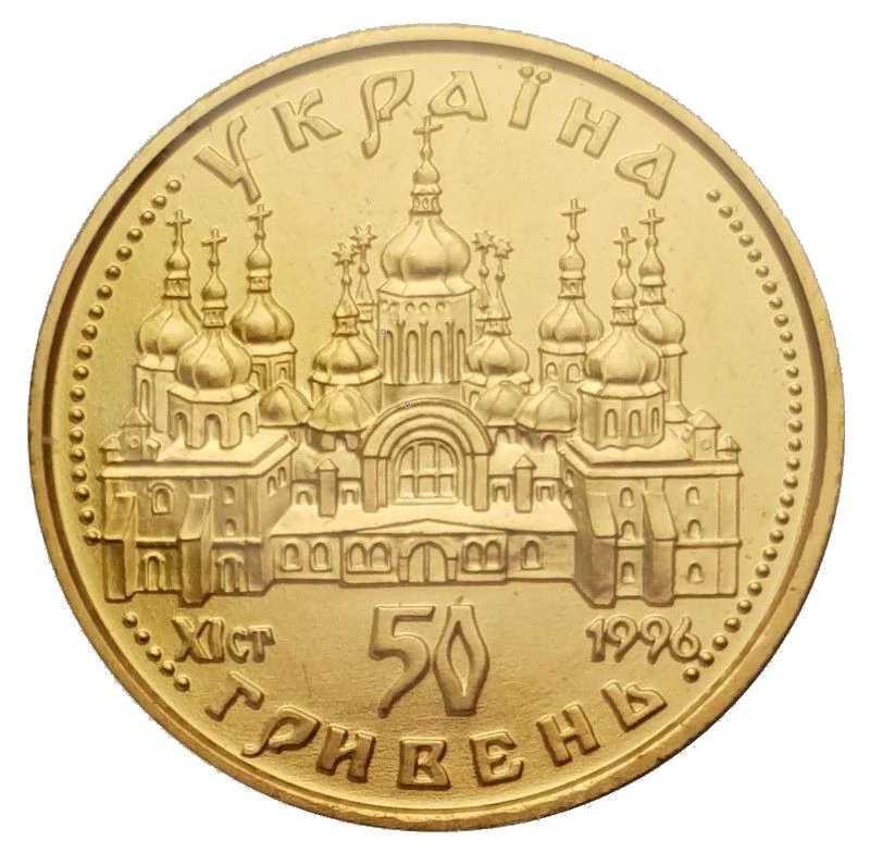 Description: The central depiction of Kyiv's 11th-century St. Sophia Cathedral, a pearl of old Russian architecture, is framed with beads. Below are inscriptions for its foundation date (11th century), face value, and issue year. Above, around the circumference, is the inscription: УКРАЇНА (Ukraine).