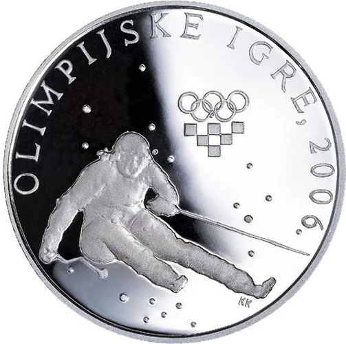 Janica Kostelić skiing with braids, Croatian Olympic Committee logo.