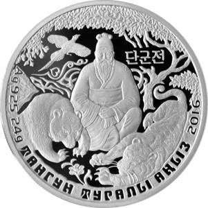 Description: The image shows Tangun under a sandalwood tree with a bear and tiger, plus Korean text. Around the edge are the inscription "ТАНГУН ТУРАЛЫ АҢЫЗ" in the state language, the issue year "2016", and "24 g of Ag 925" indicating the coin's weight, metal, and purity.
