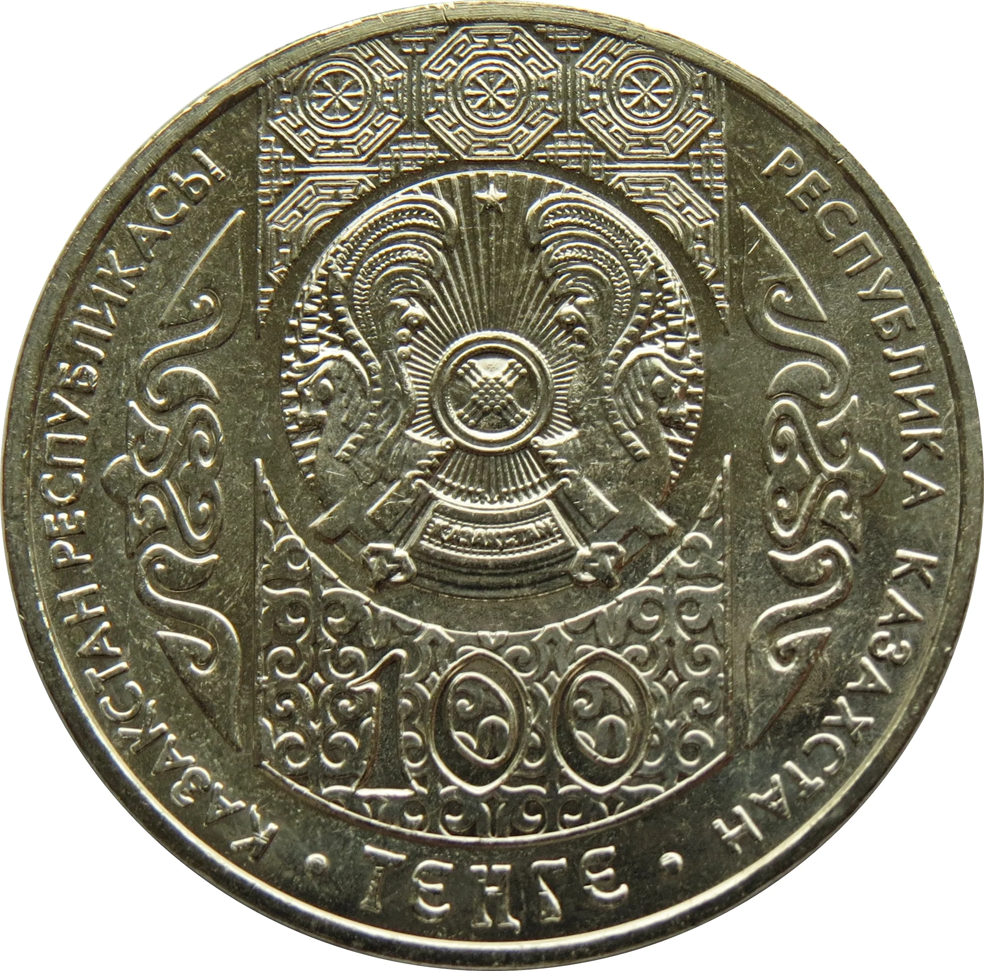 Centered on a field of Kazakh and Korean ornamentation is the Emblem of Kazakhstan. The denomination "100 ТЕҢГЕ" is below. The left and right sides feature national ornamental motifs. Surrounding inscriptions read "ҚАЗАҚСТАН РЕСПУБЛИКАСЫ" and "РЕСПУБЛИКА КАЗАХСТАН".