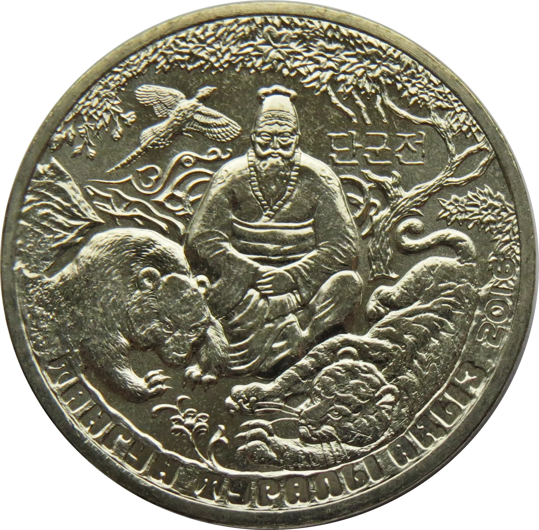 The image shows Tangun under a sandalwood tree with a bear and tiger, with Korean text. Around the edge is the inscription "ТАНГУН ТУРАЛЫ АҢЫЗ" in the state language and the year "2016".