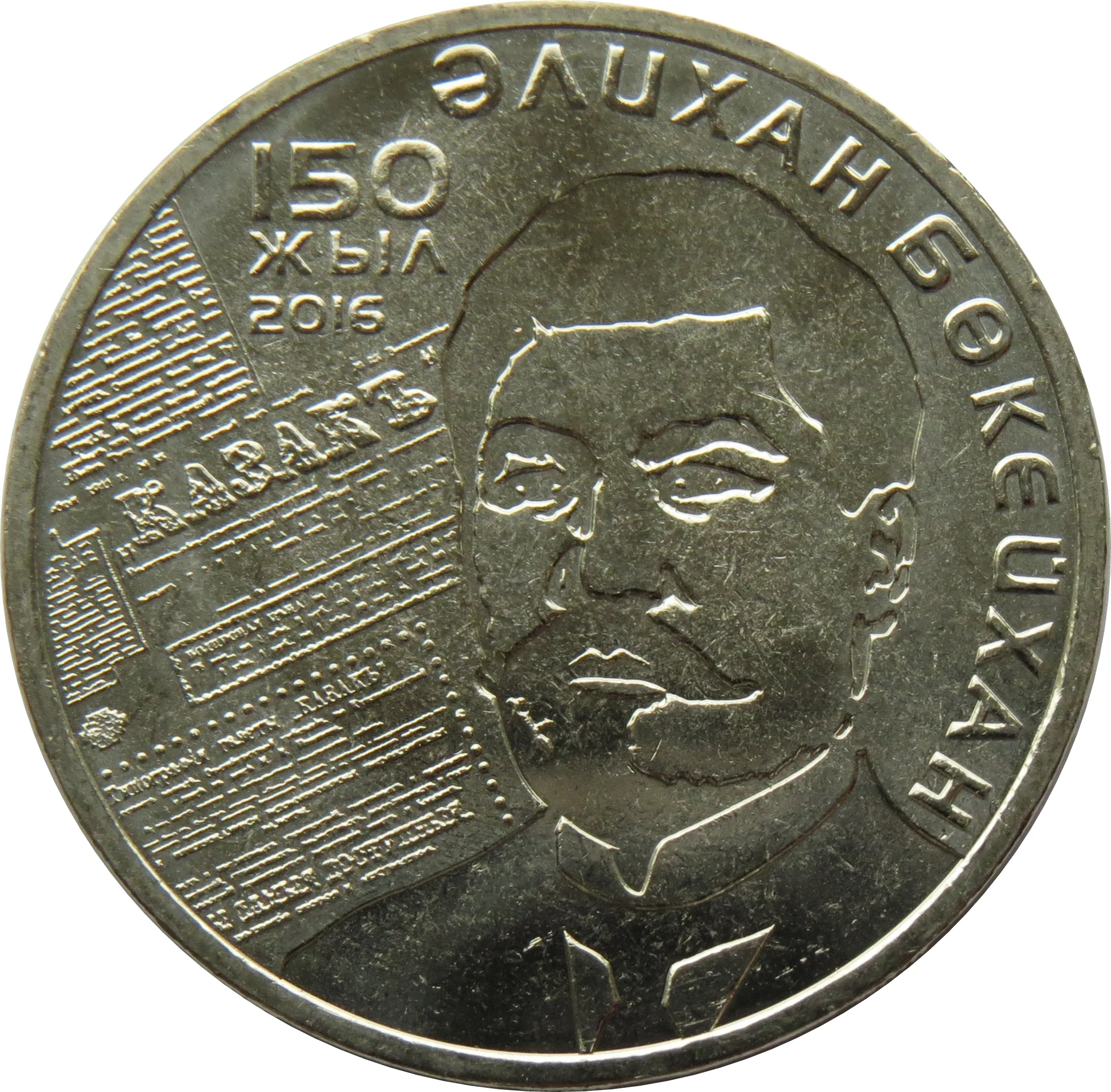 Kazakhstani figure with historical text, inscriptions "ӘЛИХАН БӨКЕЙХАН" and "150 ЖЫЛ," and the year 2016.