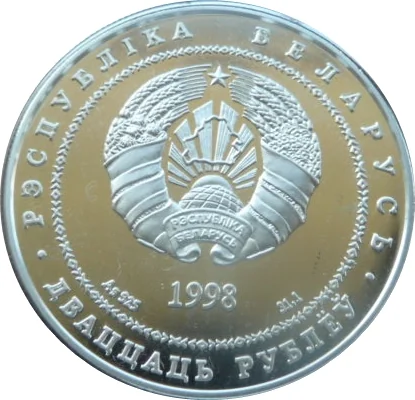 Description: The circular ornament features the relief of the State Coat of Arms. Below are the year, silver content, and alloy standard. The rim inscriptions: "РЭСПУБЛIКА БЕЛАРУСЬ" above and "ДВАЦЦАЦЬ РУБЛЁЎ" below.