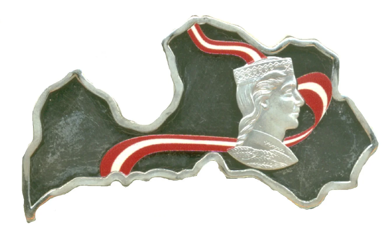A Latvian folkmaid from the 1929 5 Lati coin, facing right, with Latvia's flag as a ribbon behind her.