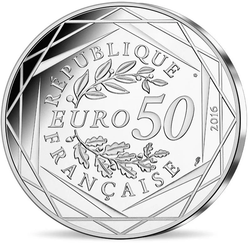 "50 EURO" flanked by laurel and oak branches, encircled by "RÉPUBLIQUE FRANÇAISE," three hexagons, and the issue year.
