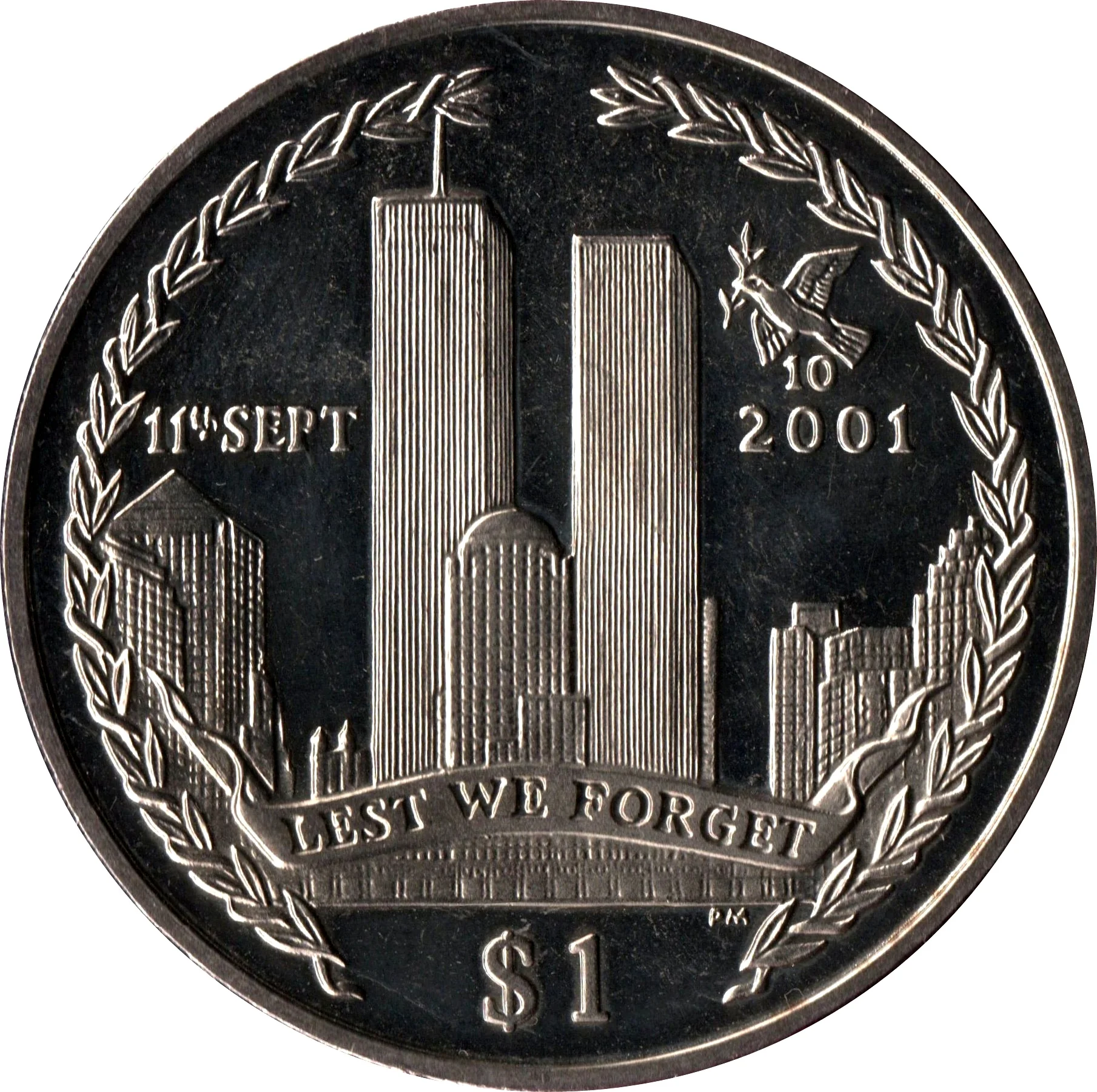 Dove with olive branch flying toward Twin Towers. Date and value.