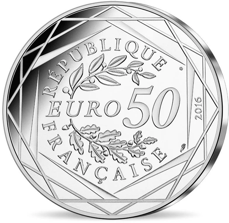 "50 EURO" flanked by laurel and oak branches, encircled by "RÉPUBLIQUE FRANÇAISE," three hexagons, and the issue year.