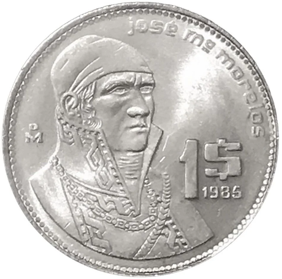José Morelos bust in uniform facing right. Left: mint mark Ṁ. Right: denomination 1$ (date below). Upper right border: "josé mª morelos".
