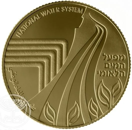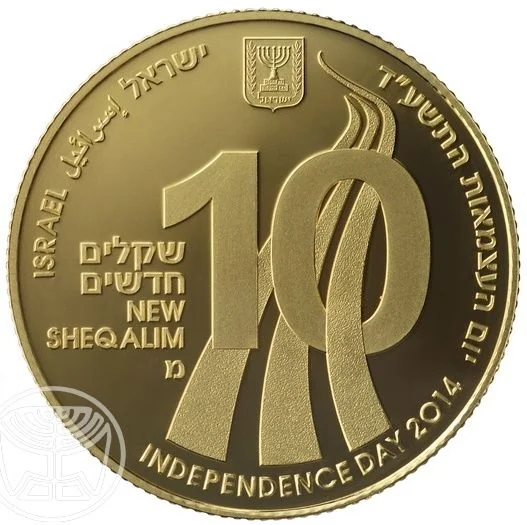 Israel State Emblem with "Israel" in three languages, mint details, face value, and an artistic depiction of the National Water Carrier's route. Border inscribed "Independence Day 2014" in English and Hebrew.