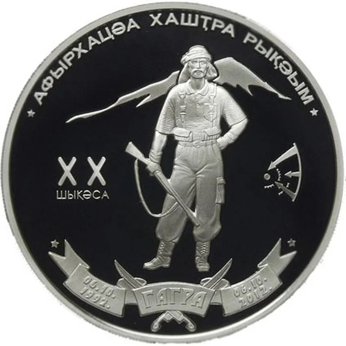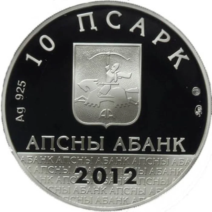 Description: On the upper mirrored field, the Bank of Abkhazia's emblem. Below it, the Abkhaz inscription "Аҧсны Абанк," above which a semicircular "10 ҦСАРК" denotes the denomination. To the right, the mint mark includes the metal symbol and fineness. On the lower matte field, "Аҧсны Абанк" and the issue year "2012" are inscribed in small raised print.