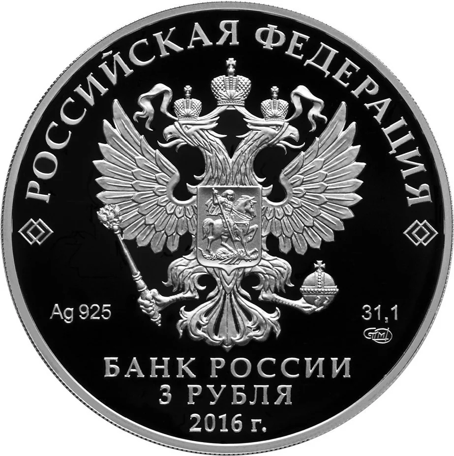 The obverse features the Russian Federation coat of arms with "РОССИЙСКАЯ ФЕДЕРАЦИЯ" above, framed by doubled rhombuses. Below are the metal specifications and mint mark. The bottom center has "БАНК РОССИИ", "3 РУБЛЯ", and "2016 г." in three lines.