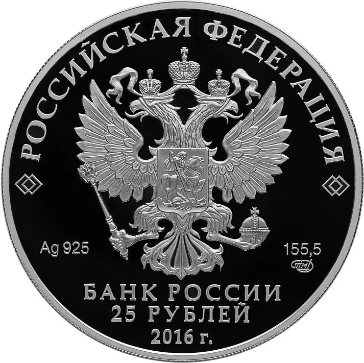 State Coat of Arms of the Russian Federation in relief. Inscriptions: "РОССИЙСКАЯ ФЕДЕРАЦИЯ", "БАНК РОССИИ", "25 РУБЛЕЙ", "2016", metal symbol, purity, mint mark, and fine metal content.