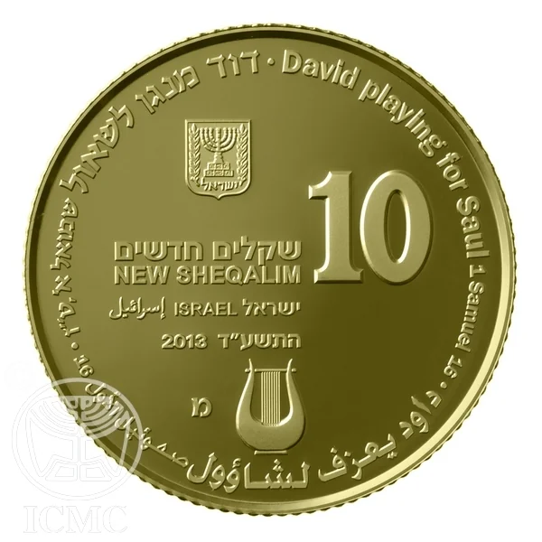 Face value, state emblem, "Israel" in three languages, mint year and mark, a decorative harp symbol, and border text "David playing for Saul" in three languages.
