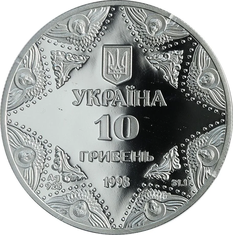 A baroque frame with seraphim heads encircles the small National Emblem of Ukraine and the inscription: УКРАЇНА / 10 ГРИВЕНЬ / 1998 / Ag 925, 31,1.