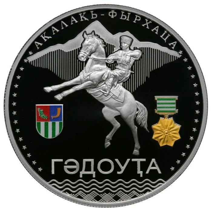 Description: Centered in the mirror field is the relief emblem of the Bank of Abkhazia, above it a semicircular inscription of the denomination "10 Apsars," and below it the Abkhaz text "Апсны Абанк." To the right is the Mint mark, metal symbol, and fineness. In the lower matte field, "Апсны Абанк" and the issue year "2013" are inscribed in small relief print.