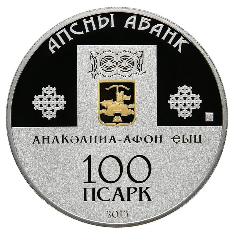 Description: Silver 925 and gold 999 coin. Features the Bank of Abkhazia emblem with Christian ornament, flanked by solar signs and mint marks. Inscriptions include "Аҧсны Абанк", "Анакопиа- Афон чыц", 100 Apsars, and 2013.