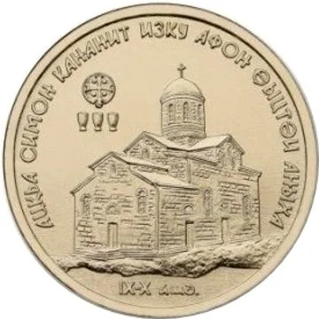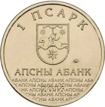 Description: Centered above is the relief State Emblem of Abkhazia, with the Abkhaz inscription "Аҧсны Абанк" (The Bank of Abkhazia) beneath it. The denomination appears in a semicircle above the emblem. Below, on a matte field, are the raised inscriptions "Аҧсны Абанк" and the mintage year "2016".