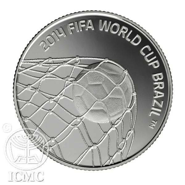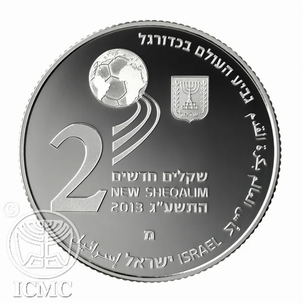 Featuring "New Sheqalim" in Hebrew and English, "Israel" in three languages, the state emblem, mint years (2013/5773), and a mint mark. A football depicted as a globe in orbit symbolizes the FIFA Games' international dynamism.