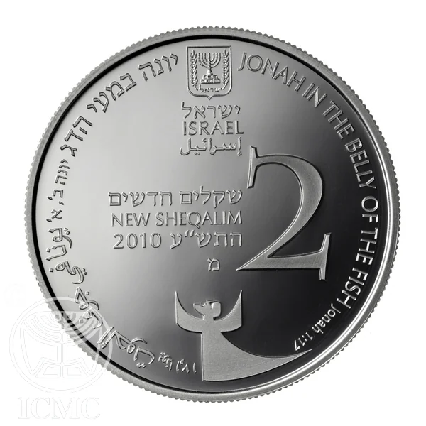 Israeli coin featuring Jonah praying inside the fish. Inscriptions in Hebrew, English, and Arabic. Includes face value, state emblem, mint year, and Jonah 2:1.