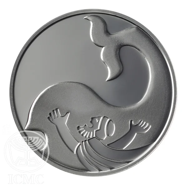 Israeli coin featuring Jonah praying inside the fish. Inscriptions in Hebrew, English, and Arabic. Includes face value, state emblem, mint year, and Jonah 2:1.