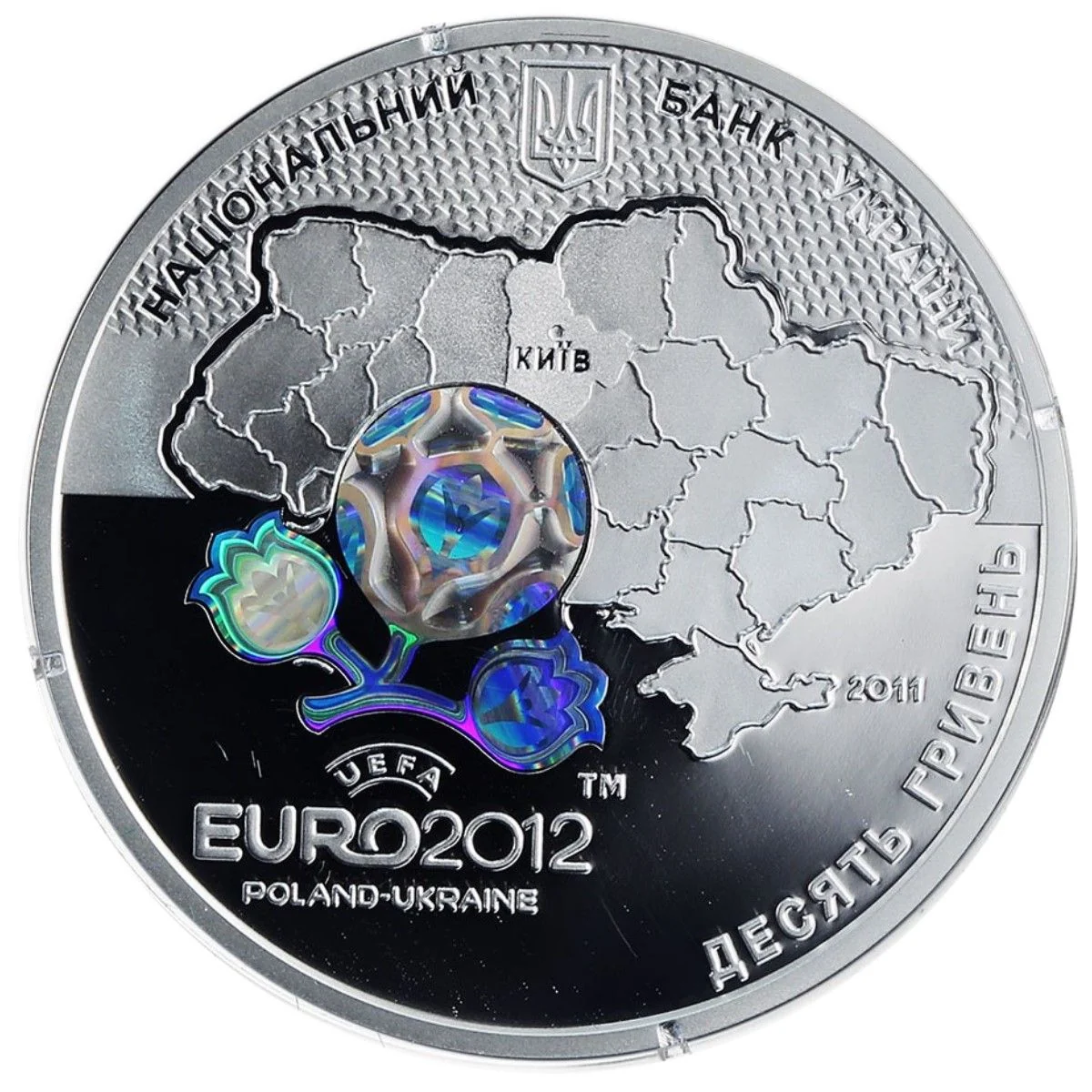 Obverse: Ukraine's Small Coat of Arms with НАЦІОНАЛЬНИЙ БАНК УКРАЇНИ. A map of Ukraine (marked КИЇВ) bears a hologram of the UEFA Euro 2012™ logo, with the text UEFA/EURO 2012™/POLAND-UKRAINE below. To the right are the year 2011 and the face value ДЕСЯТЬ ГРИВЕНЬ.