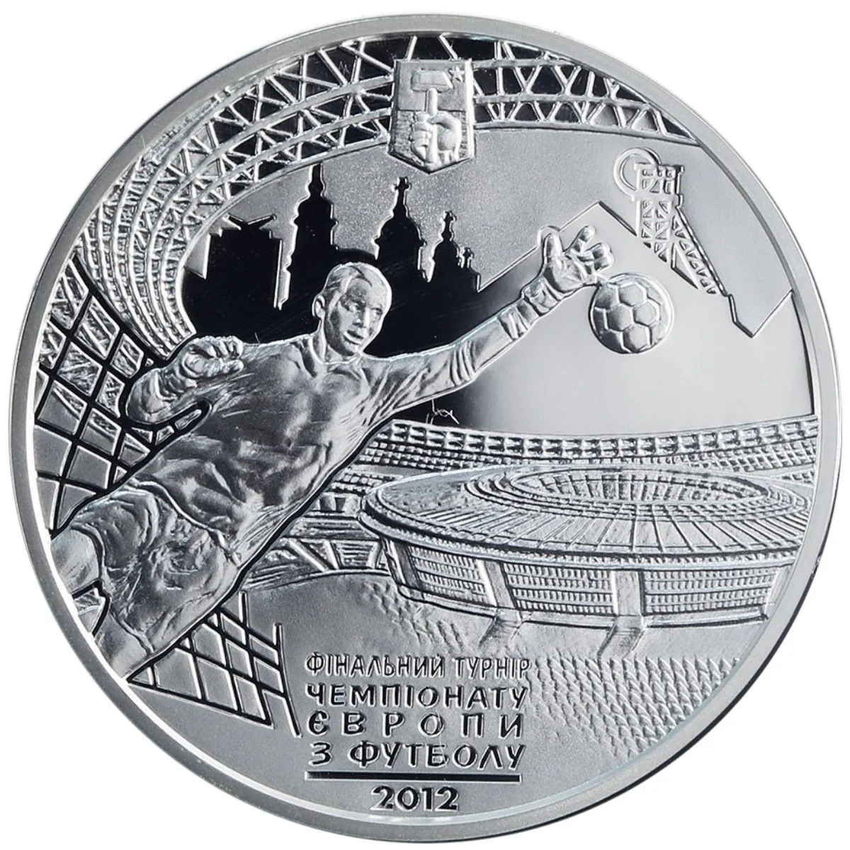 Against the Donbass Arena, a goalkeeper in motion is depicted with a ball. Above is the Donetsk cityscape and coat of arms; below is the inscription: "ФІНАЛЬНИЙ ТУРНІР ЧЕМПІОНАТУ ЄВРОПИ / З ФУТБОЛУ / 2012р."
