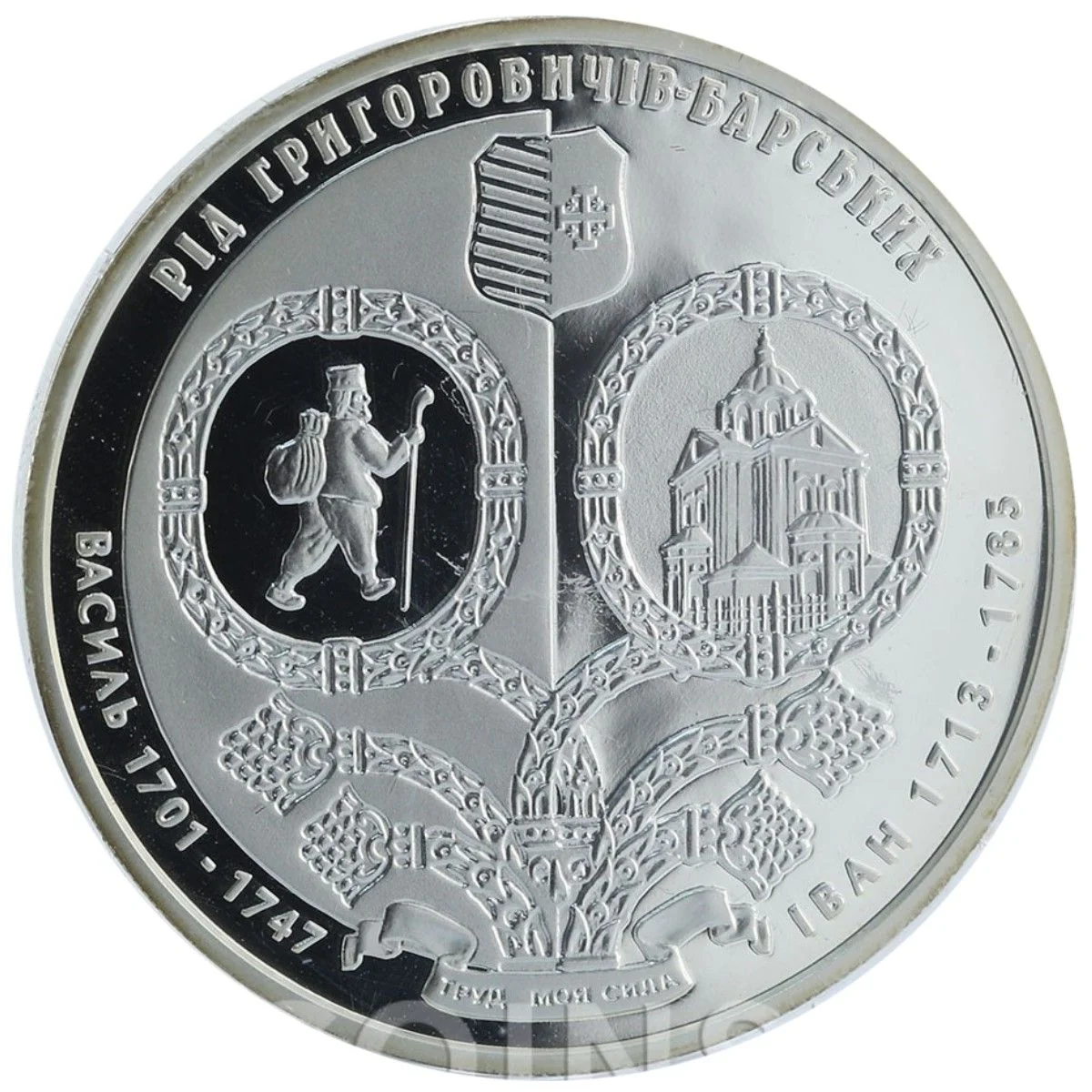 Description: The Hryhorovych-Barskyi family coat of arms features a stylized family tree with two cartouches: one with a self-portrait of traveler Vasyl (1701-1747) and the other with St. Nicholas Church on the Shore in Kyiv, designed by Ivan (1713-1785). Around the edge are inscriptions: "РІД ГРИГОРОВИЧІВ-БАРСЬКИХ" above, "ВАСИЛЬ" left, "ІВАН" right, and the motto "ТРУД МОЯ СИЛА" below.
